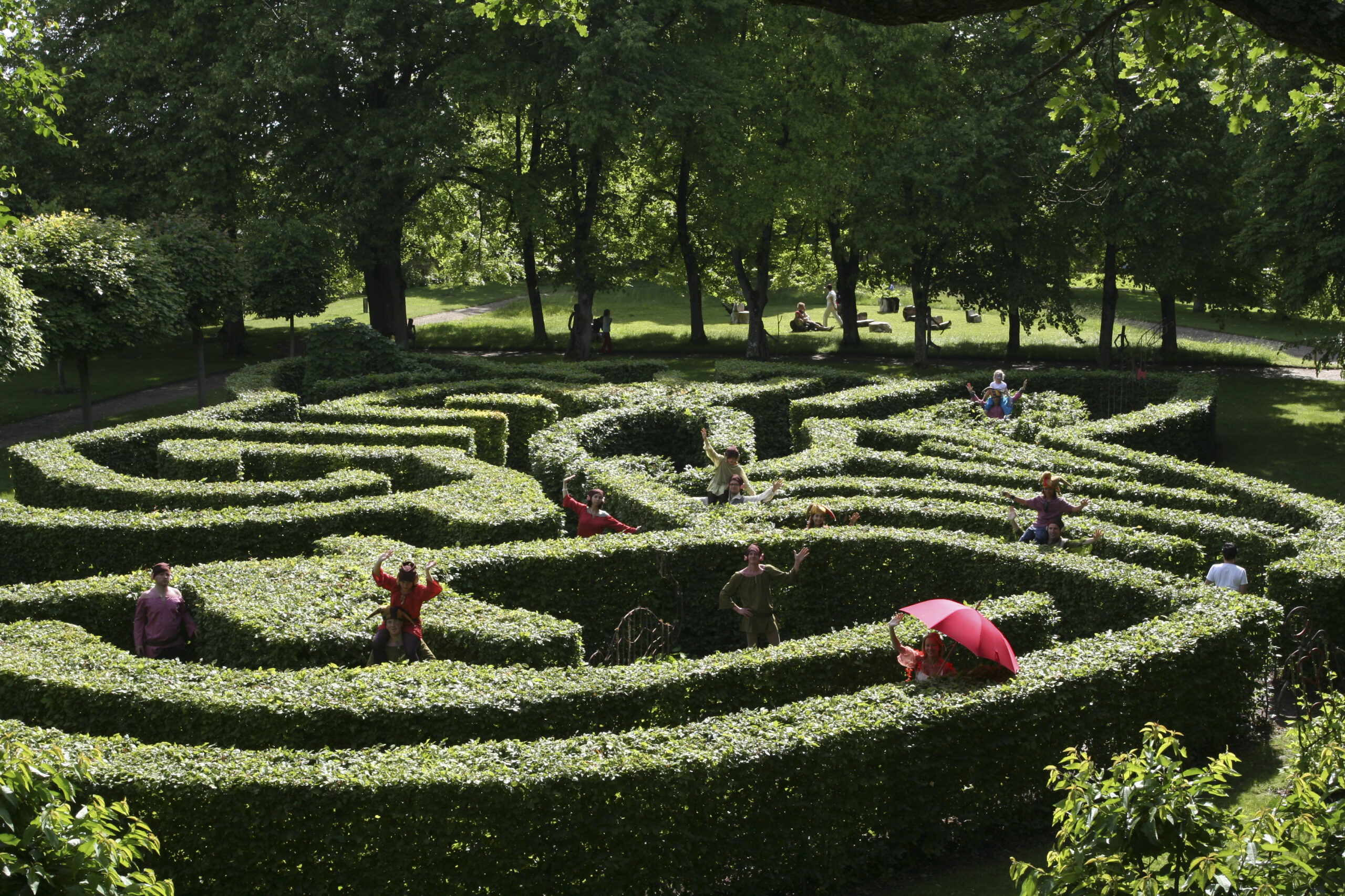 Si vous avez peur de vous perdre demandez à un de vos amis de grimper au belvédère tout proche, il vous indiquera la sortie. Car de là-haut, on reconnait le dessin du chat et on peut apprécier les cinq mille charmes qui composent la structure du Labyrinthe et qui abritent pendant l’hiver les nombreux insectes nécessaires à la vie du jardin et qui en font ainsi un havre de la biodiversité.